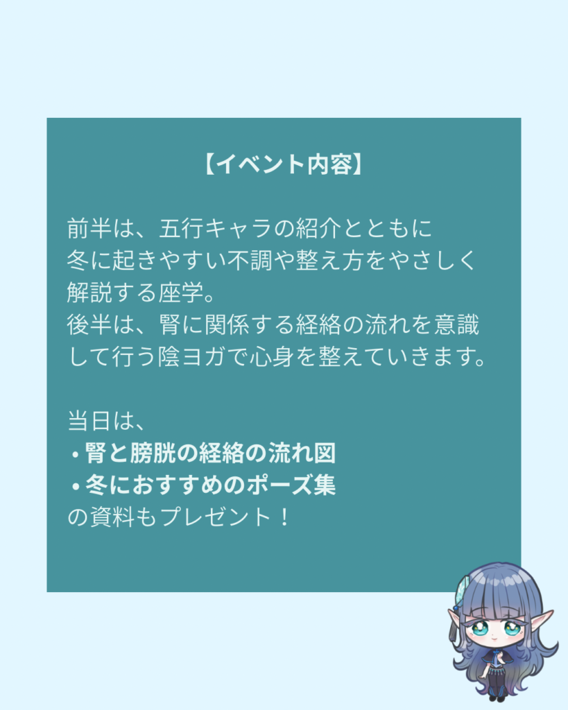 内容:座学(五行×養生)+ 陰ヨガ(腎の経絡ケア)