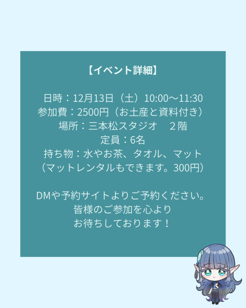 持ち物:動きやすい服/飲み物/ヨガマット(レンタル300円)
