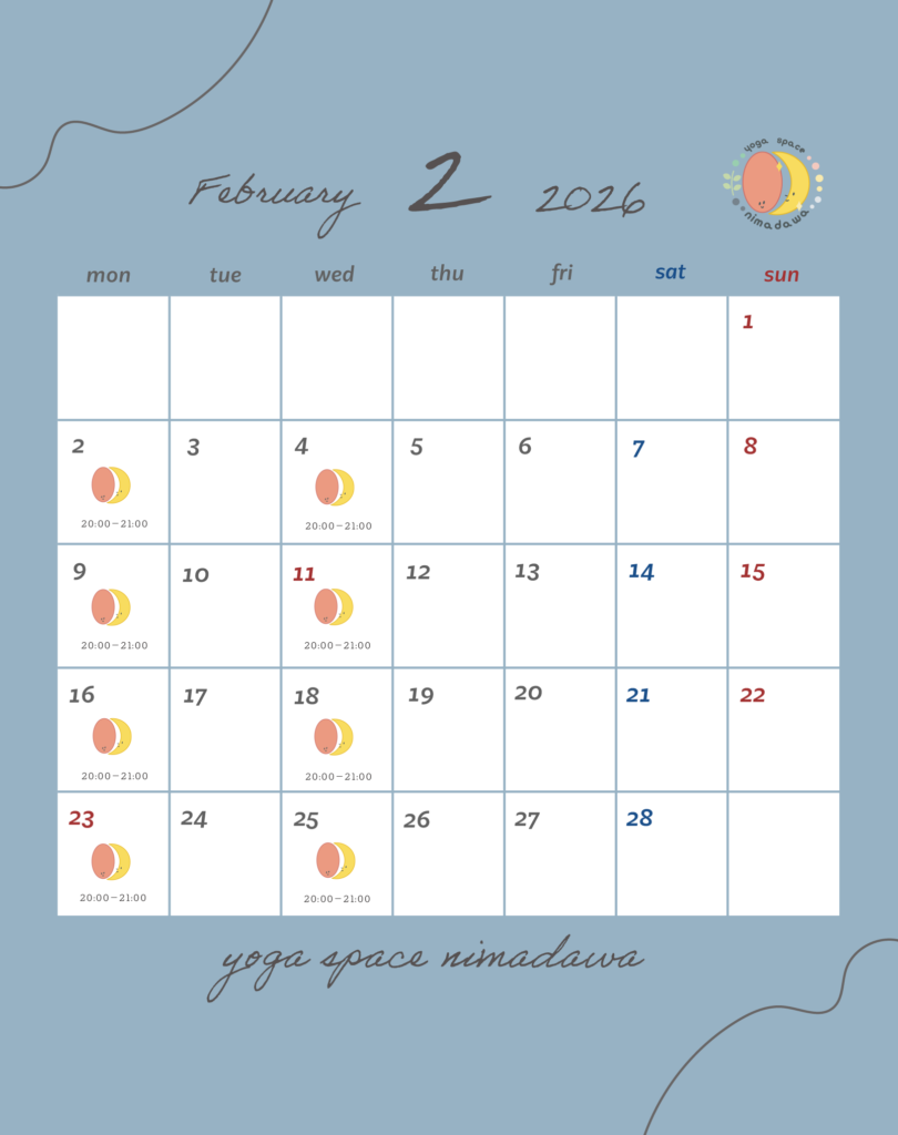 - レッスンスケジュール:2月は祝日も休まず開催いたします。 普段は平日にお越しいただけない方も、心と体を整えにぜひいらしてください。